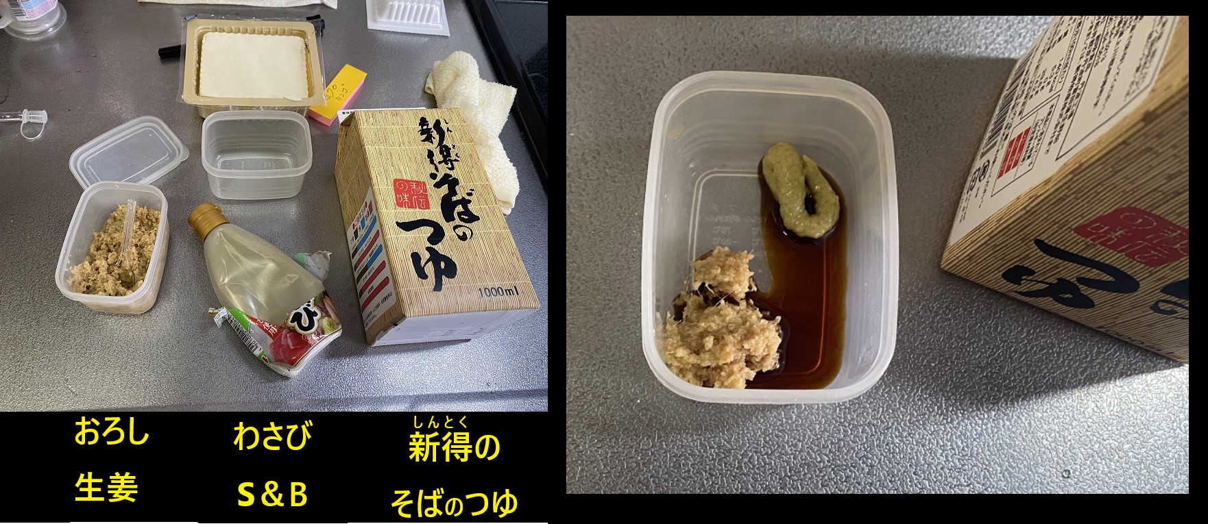 豆腐に乗せるのは「おろし生姜」敵量、「わさび」敵量、「つゆ」敵量。