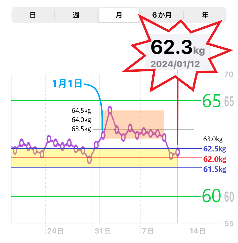 体重の推移グラフです。(60~65㎏の間隔を広げて表示しています)