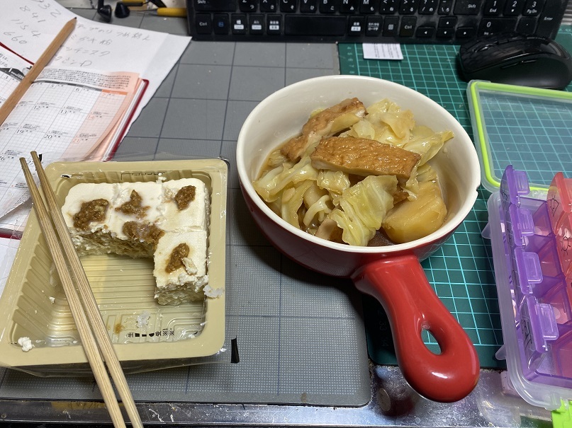 夜8時過ぎに、おろした生姜とワサビ、そばつゆを混ぜて木綿豆腐の上に乗せて、ココナッツオイルを5g振りかけいたときに、