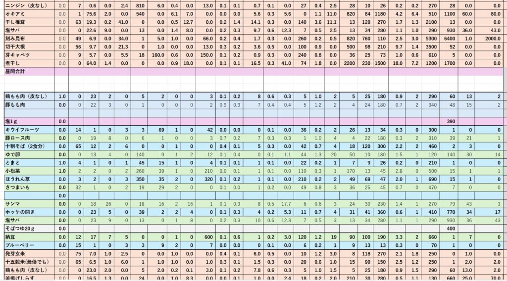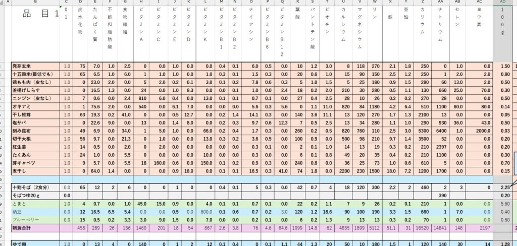 品目ごとの栄養素入力は少し手間がかかりますが、