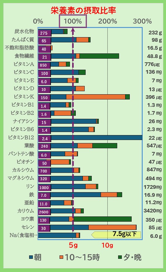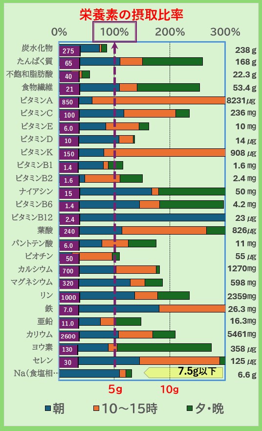 これまで、**推奨摂取量(100%)**の基準を超える項目が多く、