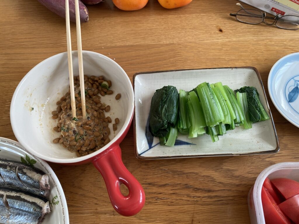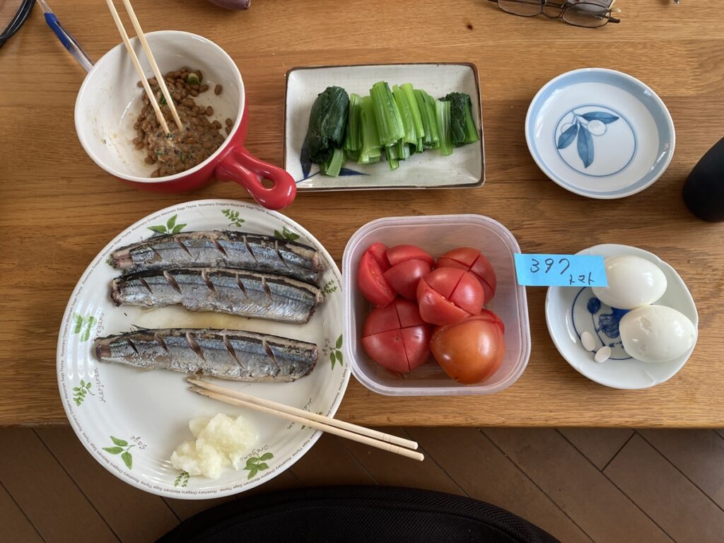 焼きサンマ、大根おろし、納豆、小松菜のおひたし、ゆで卵、トマトを並べた和定食。